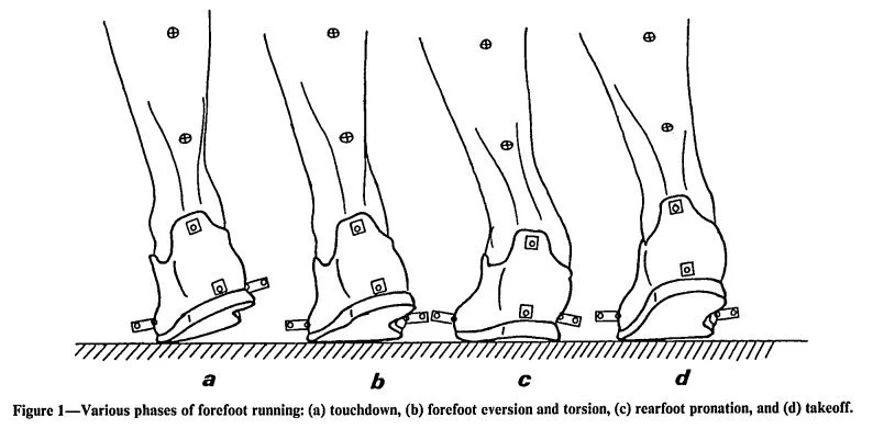 In the forefoot strike video above you can see an aggressive supinated position at initial contact, meaning the outside of the forefoot impacts first. Compared to the heel strike video there is further excursion into pronation as well as increased velocity. The velocity here increases the demand on the musculature controlling this movement.